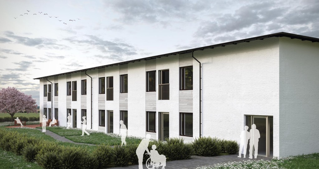 Huset är byggt med ljusa, putsade fasader med inslag av naturligt åldrande material såsom träpanel och svarta fönster. De svarta fönsterna harmoniserar väl med omgivningen och förstärker intrycket av den friska, lugna och trygga omgivningen.