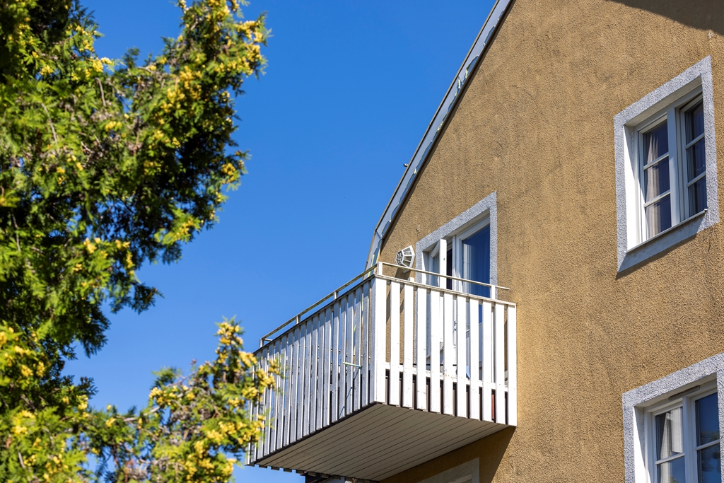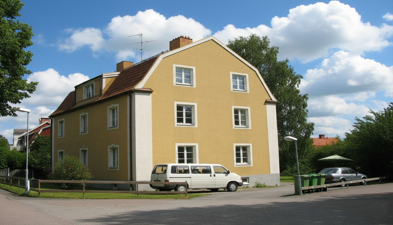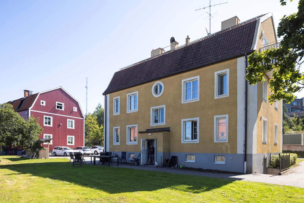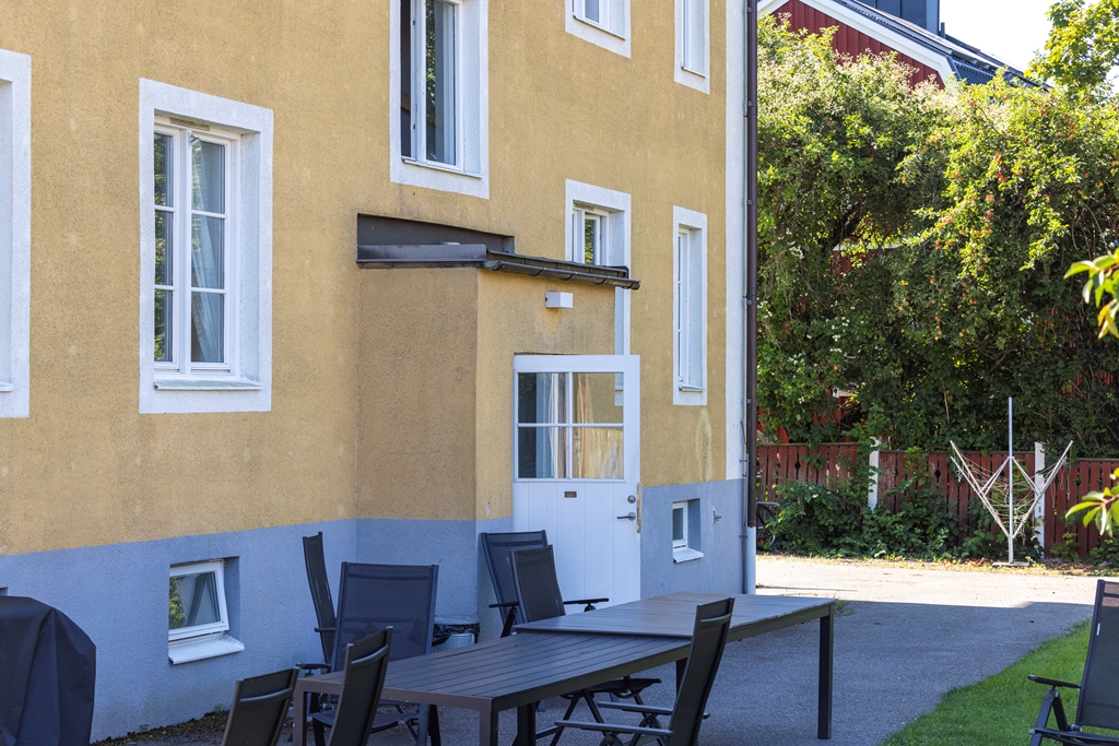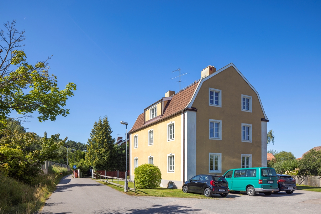 Fastigheten är en 2-plans gult stenhus med vindsvåning.