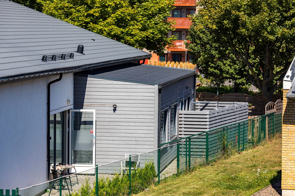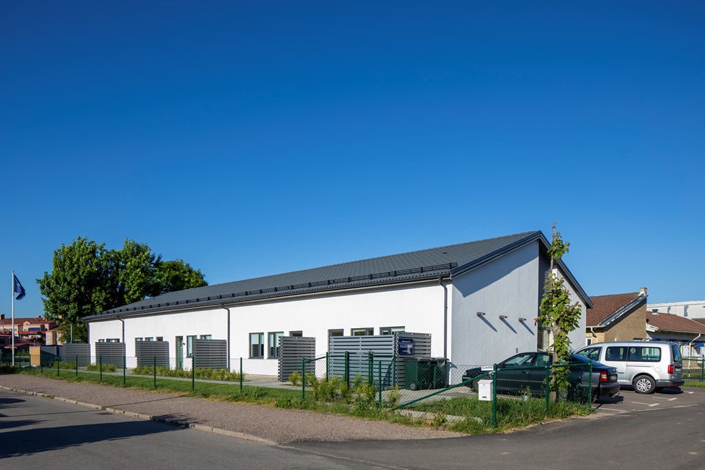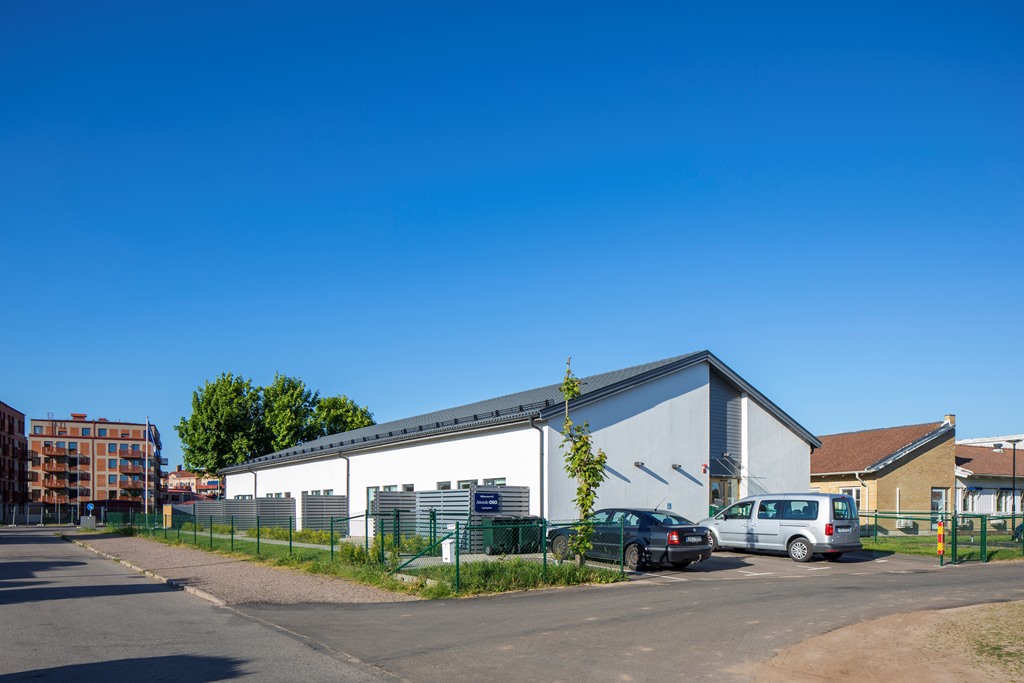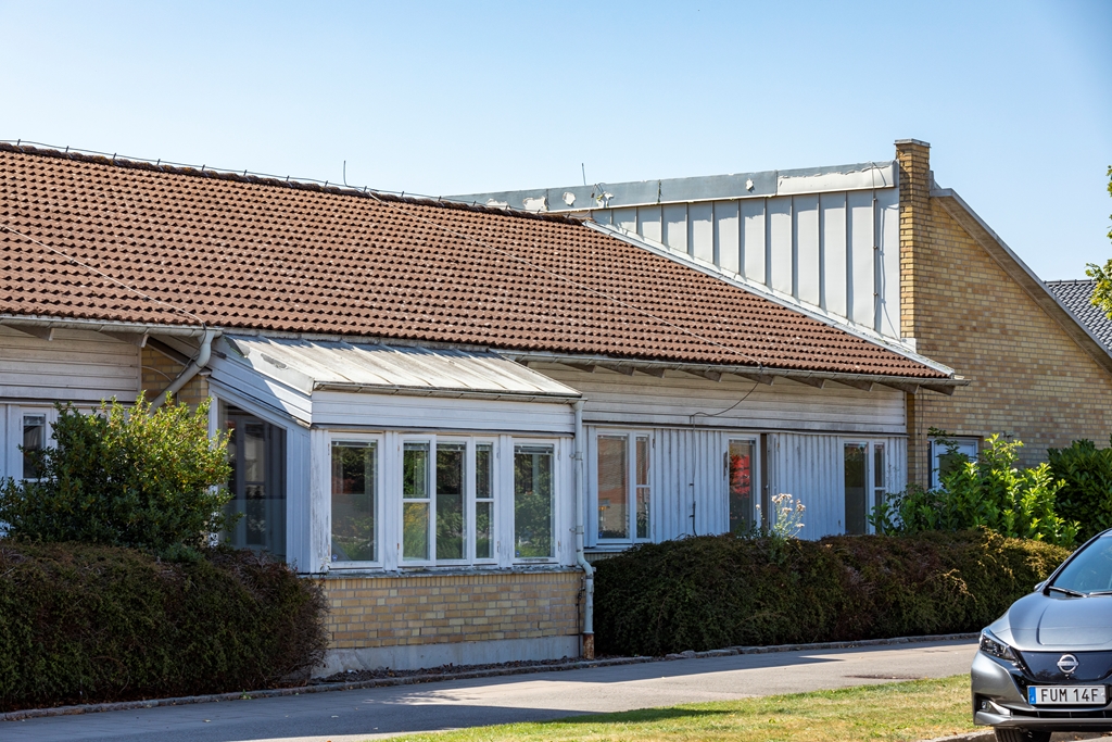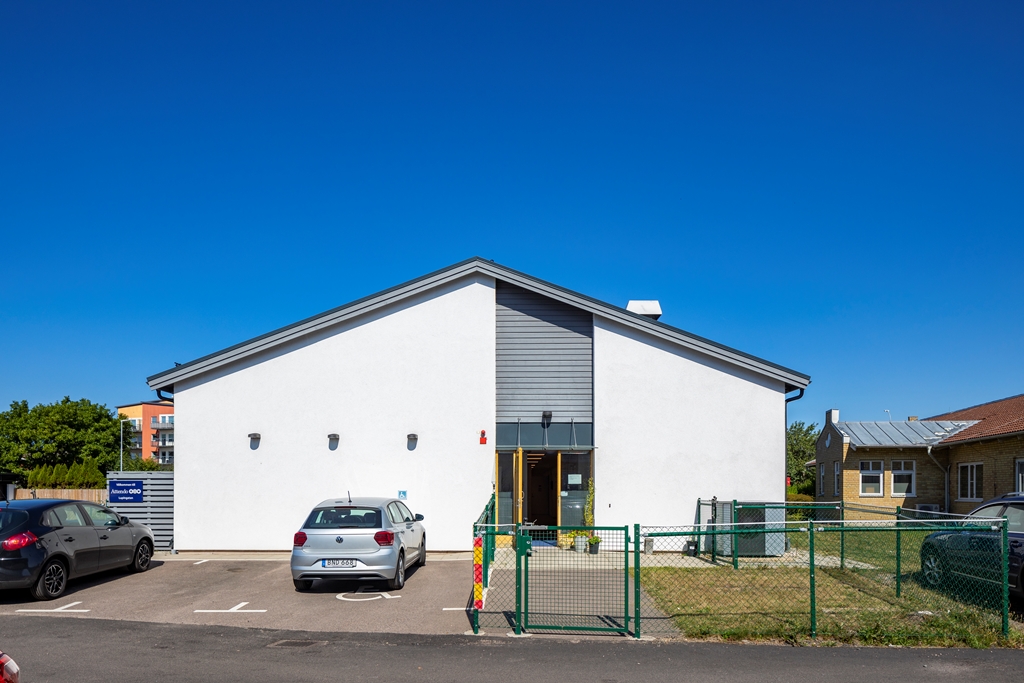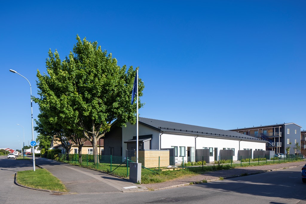 Sjöcrona 2 används som ett LSS-boende i Höganäs. Fastigheten har vita, putsade fasader och en mindre parkering vid ena kortsidan.