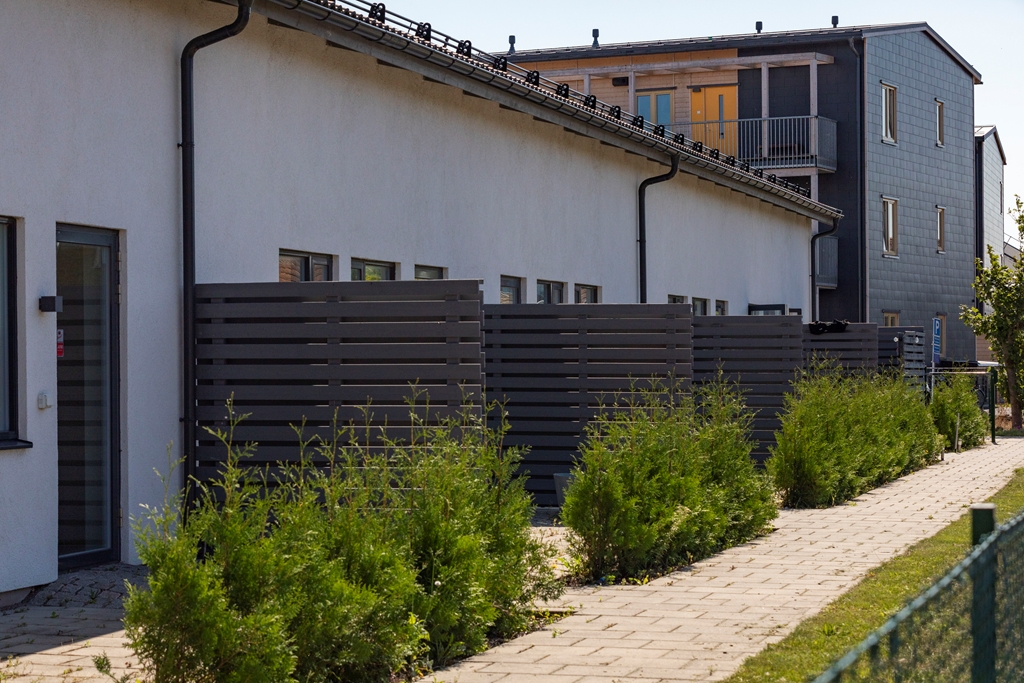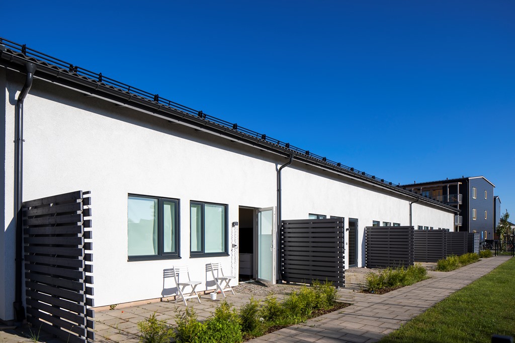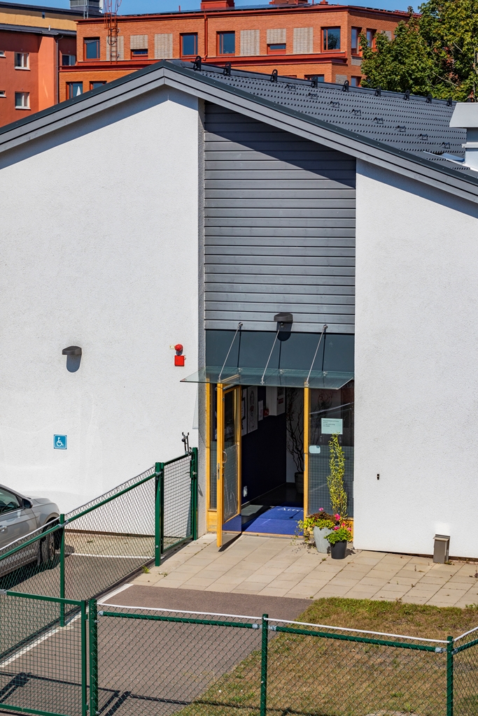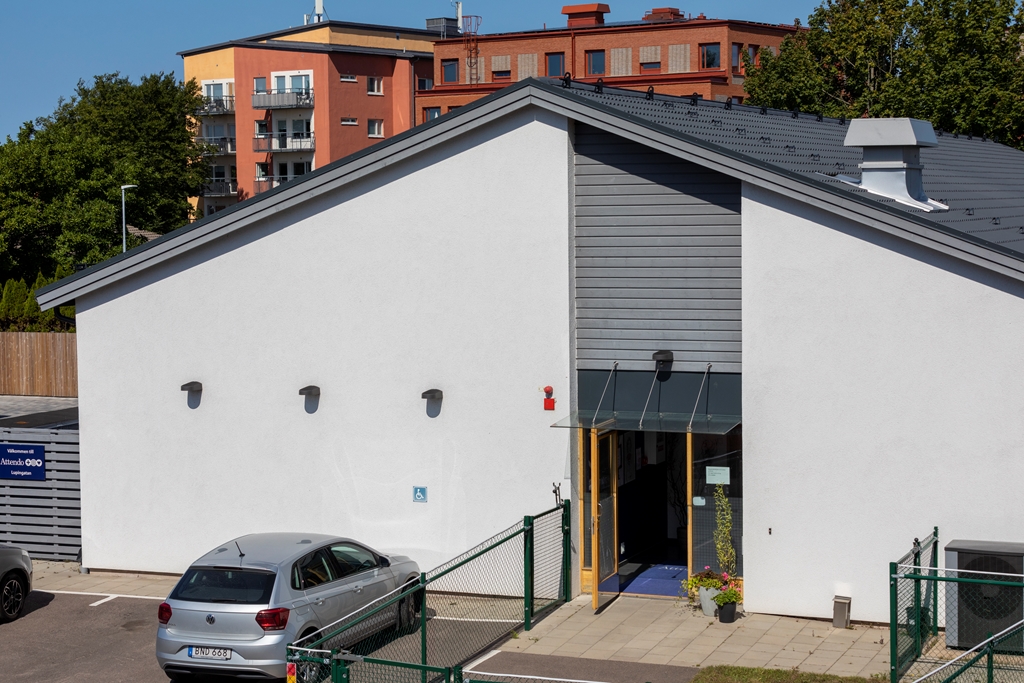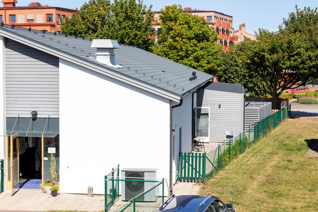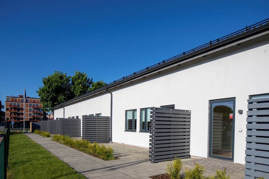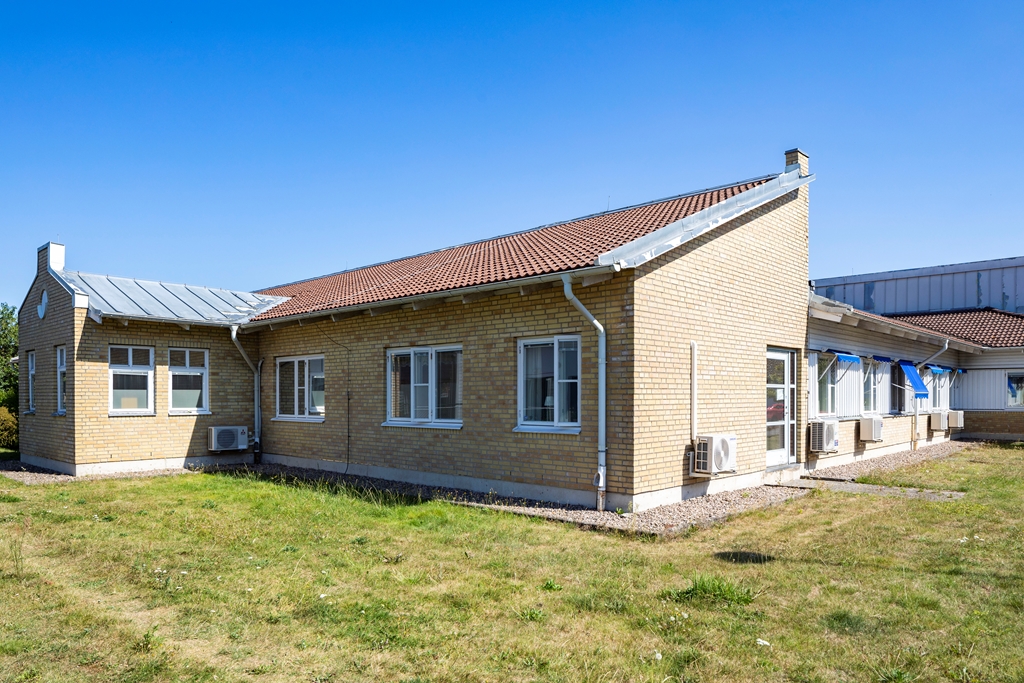Sjöcrona 2 används som ett LSS-boende i Höganäs. Fastigheten har vita, putsade fasader och en mindre parkering vid ena kortsidan.